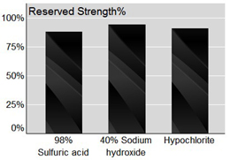 XLA is a cross-linked polyolefin based elastic fiber whose molecular microstructure makes it can withstand strong chemical corrosion. Tested in a concentration of 98% of sulfuric acid reagent, XLA doesn’t break, flexibility doesn’t drop significantly, and the injury rate of fabric is between 15%-20%; Tested in a concentration of 40% of caustic soda repeatedly, XLA doesn’t break, flexibility doesn’t drop significantly, and the injury rate of fabric is between 5%-10%; Tested in a high concentration of sodium hypochlorite salt repeatedly, XLA doesn’t break, flexibility doesn’t drop significantly, and the injury rate of fabric is between 10%-15%;