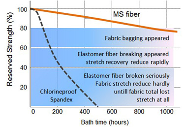 With unique advantage in chlorine bleach, XLA is a real chlorine resistance fiber. Warp-knitted fabric containing XLA is perfect choice for swimwear. Anti-chlorine performance of XLA and a well-known chlorine resistance spandex is compared in following chat: The bath temperature @50℃, Sodium hypochlorite concentration 100PPM.